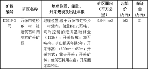 根據(jù)《中華人民共和國礦產(chǎn)資源法》、國土資源部《礦業(yè)權(quán)出讓轉(zhuǎn)讓管理暫行規(guī)定》、《探礦權(quán)采礦權(quán)招標(biāo)拍賣掛牌管理辦法(試行)》等規(guī)定,經(jīng)萬源市人民政府批準(zhǔn),萬源市自然資源局決定以拍賣方式出讓K2019-3號(萬源市虹橋鄉(xiāng)一村一社建筑石料用灰?guī)r礦采礦權(quán))采礦權(quán),我中心受萬源市自然資源局委托對以上采礦權(quán)組織拍賣,現(xiàn)將有關(guān)事項公告如下: