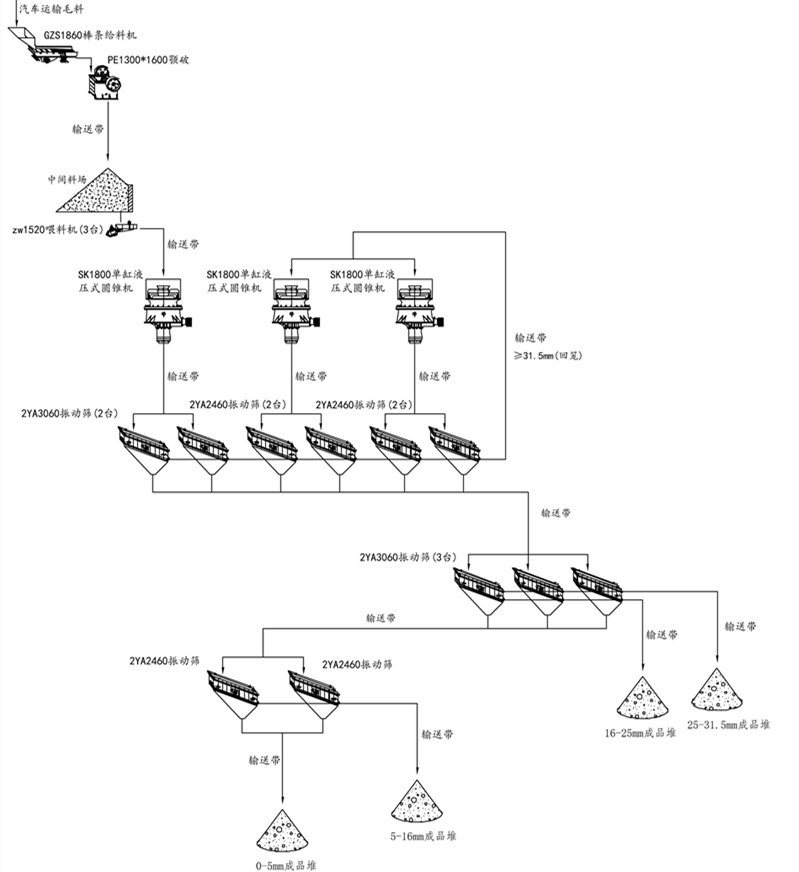 作為生產(chǎn)線來說,產(chǎn)能不同,破碎的物料不同,所需要的設(shè)備配置也不同。本文以雙金機(jī)械時(shí)產(chǎn)1000噸的客戶產(chǎn)線為例,進(jìn)行簡單介紹。首先該客戶產(chǎn)量是時(shí)產(chǎn)1000噸,破碎石灰石,要求出料規(guī)格是0-5mm,5-10mm,10-20mm,20-31.5mm,雙金機(jī)械為其配置的主設(shè)備包括GZS1860棒條給料機(jī)1臺,ZW1520振動給料機(jī)2臺,SJ.E.13.16顎破1臺,SK.56.14單缸液壓圓錐機(jī)1臺+SK.Y.1800單缸液壓圓錐機(jī)2臺+3YKQ3072振動篩6臺。除了以上主要設(shè)備外,生產(chǎn)線還應(yīng)配置輸送機(jī)等輔助設(shè)備。以下是關(guān)于時(shí)產(chǎn)1000噸的工藝流程圖(具體還應(yīng)根據(jù)需求來定制,針對石料規(guī)格、產(chǎn)量、石料用途的要求,提供合理、經(jīng)濟(jì)的設(shè)備配置流程)。
