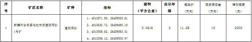 注:最終成交的采礦區(qū)范圍坐標(biāo)以與阿合奇縣國(guó)土資源局簽訂出讓合同中確定的采礦區(qū)范圍坐標(biāo)(西安1980坐標(biāo)系值)為準(zhǔn)(本次掛牌出讓礦權(quán)標(biāo)高:從2522米至2514米)。