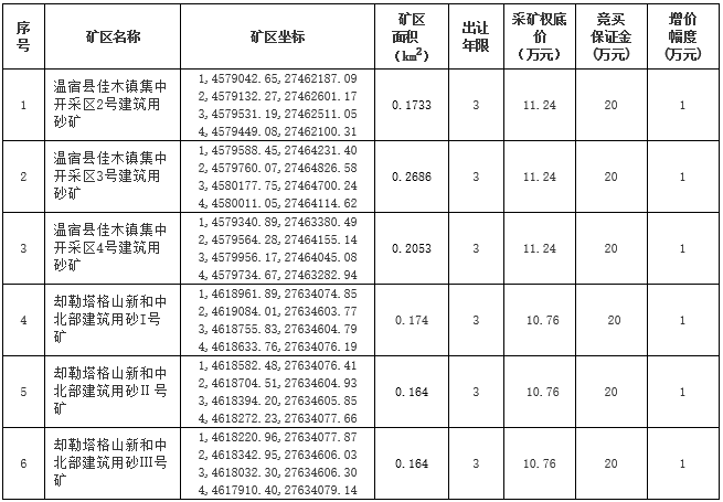 為深化礦產(chǎn)資源有償使用制度改革,培育和規(guī)范采礦權(quán)市場,根據(jù)《中華人民共和國礦產(chǎn)資源法》、《礦產(chǎn)資源開采登記管理辦法》、國土資源部《探礦權(quán)采礦權(quán)招標(biāo)拍賣掛牌管理辦法(試行)》等規(guī)定,新疆阿克蘇地區(qū)國土資源交易中心受阿克蘇地區(qū)國土資源局委托對下列采礦權(quán)以掛牌拍賣方式公開出讓,現(xiàn)將有關(guān)事項(xiàng)公告如下: