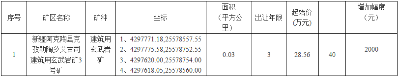 注:最終成交的采礦區(qū)范圍坐標(biāo)以與阿克陶縣國(guó)土資源局簽訂出讓合同中確定的采礦區(qū)范圍坐標(biāo)(西安1980坐標(biāo)系值)為準(zhǔn)(本次掛牌出讓礦權(quán)標(biāo)高:從1898米至1814米)。
