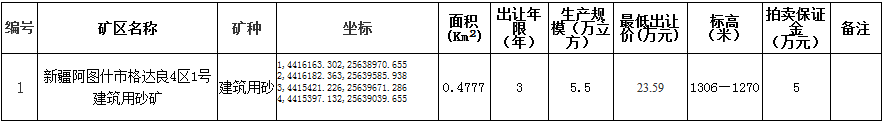阿圖什市公共資源交易中心以掛牌、拍賣方式公開出讓新疆阿圖什市格達(dá)良4區(qū)1號(hào)建筑用砂礦采礦權(quán),并委托新疆雙興拍賣有限責(zé)任公司克州分公司組織實(shí)施,現(xiàn)將有關(guān)事項(xiàng)公告如下: