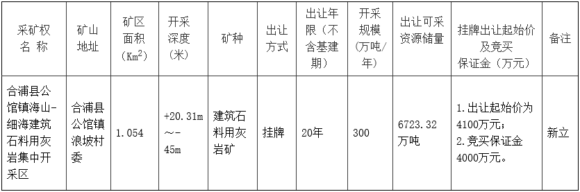 根據(jù)《中華人民共和國(guó)礦產(chǎn)資源法》、《國(guó)土資源部關(guān)于印發(fā)礦業(yè)權(quán)交易規(guī)則的通知》(國(guó)土資規(guī)〔2017〕7號(hào))、《廣西壯族自治區(qū)礦業(yè)權(quán)交易管理暫行辦法》(桂政辦發(fā)〔2012〕11號(hào))等有關(guān)法律法規(guī)政策規(guī)定,經(jīng)北海市人民政府批準(zhǔn),我局委托北海市地產(chǎn)交易中心以?huà)炫品绞焦_(kāi)出讓一個(gè)礦區(qū)的采礦權(quán)?,F(xiàn)將有關(guān)事項(xiàng)公告如下: