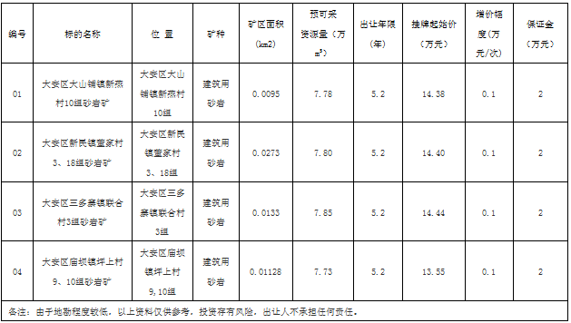 根據(jù)《中華人民共和國(guó)礦產(chǎn)資源法》、國(guó)土資源部《探礦權(quán)采礦權(quán)招標(biāo)拍賣掛牌管理辦法(試行)》、《四川省采礦權(quán)招標(biāo)拍賣掛牌出讓暫行辦法》及有關(guān)法律、法規(guī)的規(guī)定,經(jīng)自貢市大安區(qū)人民政府同意,受自貢市大安區(qū)國(guó)土資源局委托,自貢市公共資源交易服務(wù)中心組織實(shí)施大安區(qū)大山鋪鎮(zhèn)新燕村10組等4處砂巖礦采礦權(quán)公開(kāi)掛牌出讓工作?,F(xiàn)將出讓相關(guān)事項(xiàng)公告如下:
