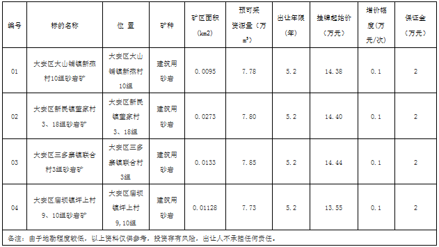 根據(jù)《中華人民共和國礦產(chǎn)資源法》、國土資源部《探礦權采礦權招標拍賣掛牌管理辦法(試行)》、《四川省采礦權招標拍賣掛牌出讓暫行辦法》及有關法律、法規(guī)的規(guī)定,經(jīng)自貢市大安區(qū)人民政府同意,受自貢市大安區(qū)國土資源局委托,自貢市公共資源交易服務中心組織實施大安區(qū)大山鋪鎮(zhèn)新燕村10組等4處砂巖礦采礦權公開掛牌出讓工作。現(xiàn)將出讓相關事項公告如下: