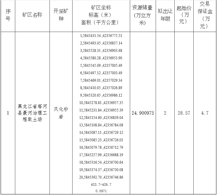 根據(jù)國(guó)土資源部《礦業(yè)權(quán)交易規(guī)則》(國(guó)土資規(guī)〔2017〕7號(hào)),大興安嶺地區(qū)行署國(guó)土資源局將對(duì)塔河縣1宗采石場(chǎng)采礦權(quán)進(jìn)行公開掛牌出讓。現(xiàn)將有關(guān)事項(xiàng)公告如下: