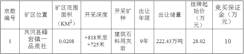 2、擬出讓采礦權(quán)礦區(qū)資源量及級(jí)別,以按照規(guī)定備案的儲(chǔ)量報(bào)告為準(zhǔn),競(jìng)買人報(bào)名參與競(jìng)買,即對(duì)出讓的礦區(qū)資源量及級(jí)別表示認(rèn)同。