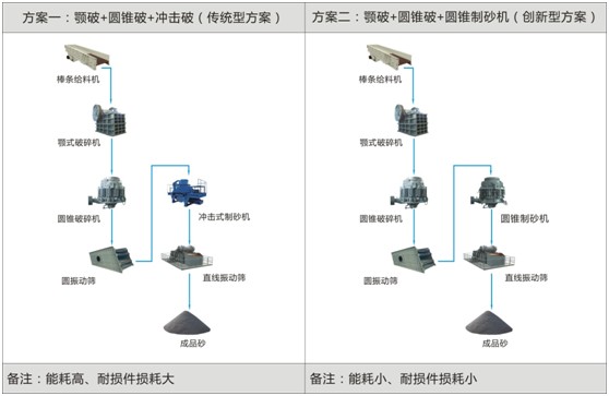 方案一優(yōu)勢:沖擊式制砂機襯板磨損較大,一般壽命是120h,耐磨件消耗大,設備能耗大,而且襯板更換時間較長,大大提高了成產(chǎn)過程中的成本,影響了顧客的經(jīng)濟效益,這種傳統(tǒng)型制砂方案慢慢被顧客所摒棄。
