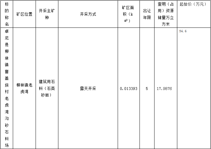 根據(jù)《中華人民共和國礦產(chǎn)資源法》、國土資源部《探礦權(quán)采礦權(quán)招標拍賣掛牌管理辦法(試行)》及相關(guān)法律、法規(guī)的規(guī)定,經(jīng)卓尼縣人民政府批準,卓尼縣國土資源局決定在甘南州公共資源交易中心平臺上采取掛牌出讓方式公開拍賣出讓以下四處砂石采礦權(quán),現(xiàn)將有關(guān)事項公告如下: