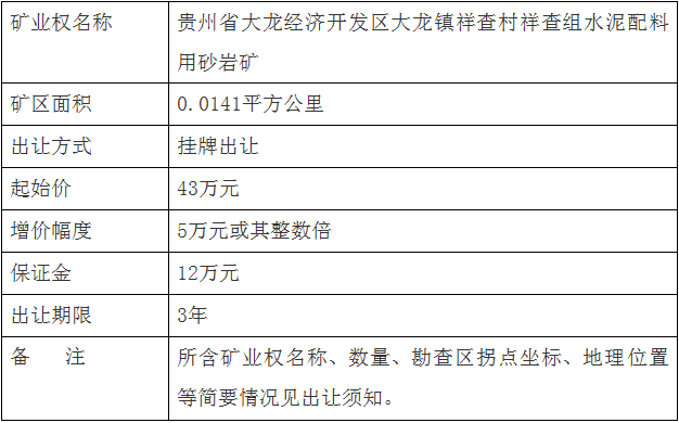 貴州省大龍經(jīng)濟開發(fā)區(qū)大龍鎮(zhèn)祥查村祥查組水泥配料用砂巖礦采礦權(quán)掛牌時間為:2018年2月9日9時至2018年3月1日16時。