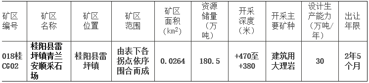 根據《中華人民共和國礦產資源法》、國土資源部關于印發(fā)《礦業(yè)權交易規(guī)則》(國土資規(guī)〔2017〕7號)的通知和《國土資源部關于完善礦產資源開采審批登記管理有關事項的通知》(國土資規(guī)〔2017〕16號)和《湖南省人民政府辦公廳關于印發(fā)〈湖南省礦業(yè)權招標拍賣掛牌出讓管理辦法〉的通知》(湘政辦發(fā)〔2016〕65號)等有關規(guī)定,經桂陽縣人民政府批準同意,我局決定在湖南省國土資源網上交易系統(tǒng)(以下簡稱“網掛系統(tǒng)”)(http://www.hngtjy.com)以掛牌方式出讓以下礦區(qū)采礦權,并委托桂陽縣國土資源產權交易中心承辦具體事宜?,F將有關事項公告如下: