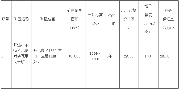 根據(jù)國土資源部《礦業(yè)權交易規(guī)則》以及《云南省探礦權采礦權管理辦法》和《云南省礦業(yè)權交易辦法》的規(guī)定,受開遠市國土資源局委托,紅河州公共資源交易中心擬對開遠市羊街鄉(xiāng)水塘哨磚瓦用頁巖礦采礦權進行掛牌出讓,現(xiàn)將有關事項公告如下: