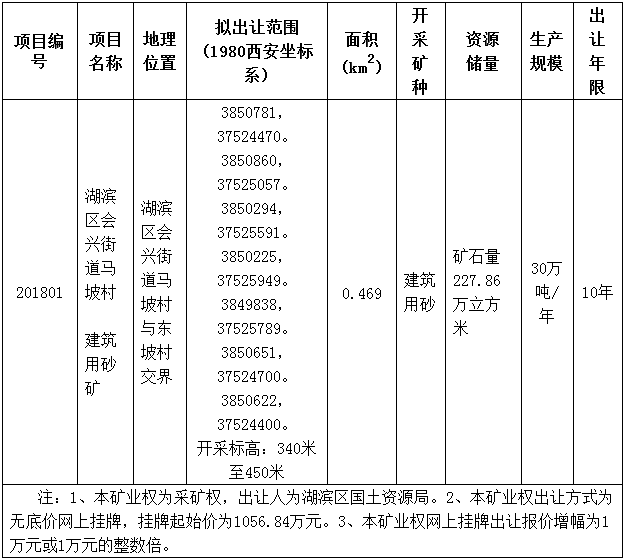 受三門峽市湖濱區(qū)國土資源局委托,根據(jù)國土資源部《礦業(yè)權(quán)交易規(guī)則》、三門峽市國土資源局轉(zhuǎn)發(fā)《河南省國土資源廳貫徹國土資源部關(guān)于印發(fā)〈礦業(yè)權(quán)交易規(guī)則〉通知的意見》的通知{三國土資(2017)265號(hào)}等相關(guān)規(guī)定,三門峽市公共資源交易中心(下稱交易中心)就出讓人三門峽市湖濱區(qū)國土資源局?jǐn)M出讓的“湖濱區(qū)會(huì)興街道馬坡村建筑用砂礦”采礦權(quán)網(wǎng)上掛牌事宜公告如下:
