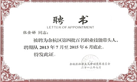 日前,余杭第四批百名技能帶頭人名單出爐,經(jīng)過組織推薦、個(gè)人自薦、評(píng)審小組評(píng)定、意見征求、公示等環(huán)節(jié),最終確定了來自企事業(yè)單位的100名技術(shù)能手成為余杭區(qū)第四批百名職業(yè)技能帶頭人。我公司員工張金娣入選,聘期為兩年(2013年7月至2015年6月)。