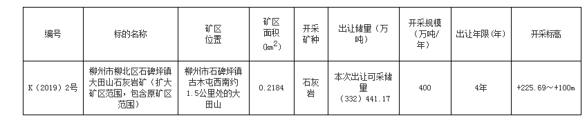1.本次招標(biāo)出讓的采礦權(quán)為規(guī)劃保留的柳州市柳北區(qū)石碑坪鎮(zhèn)大田山石灰?guī)r礦擴(kuò)大礦區(qū)增加的資源儲量部分采礦權(quán),該部分采礦權(quán)不具備獨立開發(fā)條件,新出讓的采礦權(quán)必須利用原礦山的開采系統(tǒng),包括場地、設(shè)備進(jìn)行生產(chǎn)。