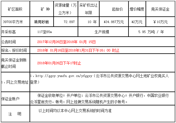 本次掛牌交易競買人通過云浮市公共資源交易網(wǎng)報名報價,不接受電話、郵寄和口頭報價。本次礦業(yè)權(quán)掛牌出讓按照價高者得原則確定競得人,掛牌時間截止時有競買人表示愿意繼續(xù)競價的,則轉(zhuǎn)入現(xiàn)場競價確定競得人。