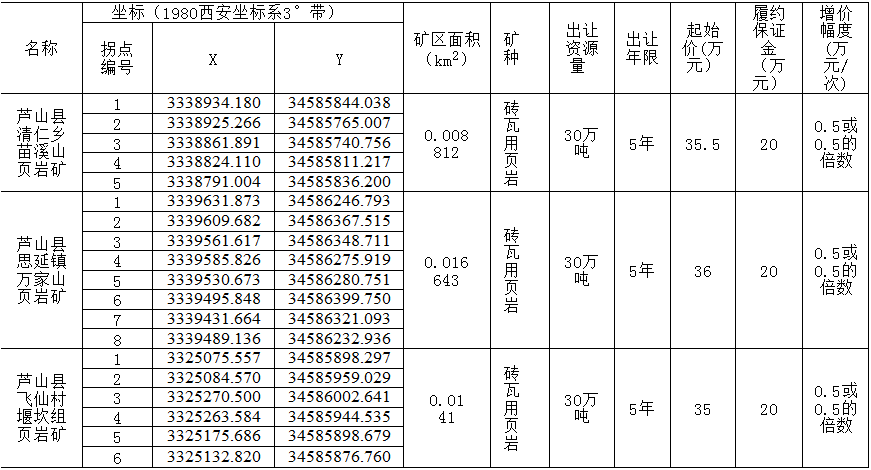 根據(jù)《中華人民共和國礦產(chǎn)資源法》、《探礦權(quán)采礦權(quán)招標拍賣掛牌管理辦法(試行)》、《關(guān)于建立健全礦業(yè)權(quán)有形市場的通知》、《礦業(yè)權(quán)交易規(guī)則(試行)》、《四川省采礦權(quán)招標拍賣掛牌出讓暫行辦法》等相關(guān)規(guī)定,蘆山縣人民政府決定掛牌出讓3宗采礦權(quán)。現(xiàn)將有關(guān)事項公告如下: