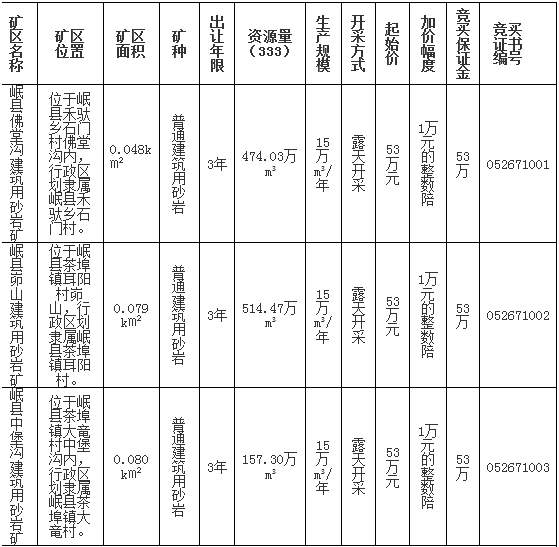 根據(jù)《中華人民共和國(guó)礦產(chǎn)資源法》、《探礦權(quán)采礦權(quán)招標(biāo)拍賣管理辦法(試行)》、《礦產(chǎn)資源開(kāi)采登記管理辦法》以及《甘肅省礦業(yè)權(quán)招標(biāo)拍賣掛牌出讓暫行》、《岷縣礦產(chǎn)資源總體規(guī)劃(2015-2020)》等相關(guān)法律、法規(guī)之規(guī)定,經(jīng)岷縣人民政府批準(zhǔn),岷縣國(guó)土資源局決定對(duì)岷縣佛堂溝建筑用砂巖礦等采礦權(quán)進(jìn)行公開(kāi)掛牌出讓,具體掛牌出讓活動(dòng)由岷縣國(guó)土資源局委托甘肅正大拍賣有限責(zé)任公司組織實(shí)施,現(xiàn)將有關(guān)事項(xiàng)公告如下: