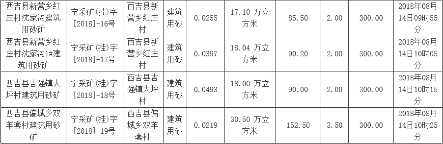 以上各采礦權(quán)掛牌開(kāi)始時(shí)間(網(wǎng)上申請(qǐng)、繳納保證金、報(bào)價(jià)起始時(shí)間)均為2018年07月30日08時(shí)00分;網(wǎng)上申請(qǐng)、交易保證金繳納(到賬)截止時(shí)間均為2018年08月13日16時(shí)30分。