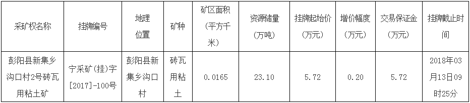 經(jīng)彭陽(yáng)縣人民政府批準(zhǔn),彭陽(yáng)縣國(guó)土資源局委托寧夏公共資源交易服務(wù)中心,以網(wǎng)上掛牌交易方式重新出讓寧夏彭陽(yáng)縣1宗磚瓦用粘土礦采礦權(quán)。現(xiàn)將有關(guān)事項(xiàng)公告如下: