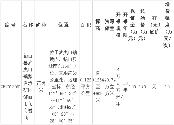 根據(jù)《江西省土地使用權(quán)和礦業(yè)權(quán)統(tǒng)一網(wǎng)上交易管理辦法》等有關(guān)規(guī)定,受鉛山縣國土資源局委托,上饒市國土資源市場交易管理所以網(wǎng)上拍賣方式出讓下列礦業(yè)權(quán)。
