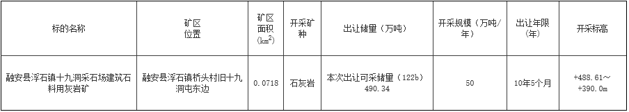 本次掛牌出讓的融安縣浮石鎮(zhèn)十九洞采石場(chǎng)建筑石料用灰?guī)r礦采礦權(quán)勘查成果資料和實(shí)際情況可能有一定的出入,投資風(fēng)險(xiǎn)由競(jìng)得人自行承擔(dān)。