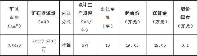 競買意向人可在公告申請時(shí)間內(nèi)到銅仁市公共資源交易中心石阡分中心購買掛牌出讓文件和資料(300元/套),申請競買每個(gè)采礦權(quán)需購買一套。