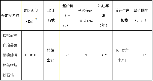 松桃苗族自治縣黃板鎮(zhèn)妙灣村茶樹坡砂石場(chǎng)采礦權(quán)掛牌起始價(jià)為6.3萬元人民幣(不含由松桃苗族自治縣國土資源局墊資的前期工作成本),掛牌出讓的采礦權(quán)報(bào)價(jià)最小遞進(jìn)金額為0.5萬元人民幣的整數(shù)倍。根據(jù)《松桃苗族自治縣黃板鎮(zhèn)妙灣村茶樹坡砂石場(chǎng)開發(fā)利用方案》,該采礦權(quán)出讓期限為5年,設(shè)計(jì)生產(chǎn)規(guī)模6萬立方米/年,開采方式為露天開采。報(bào)名時(shí)繳納競(jìng)買保證金3萬元人民幣。