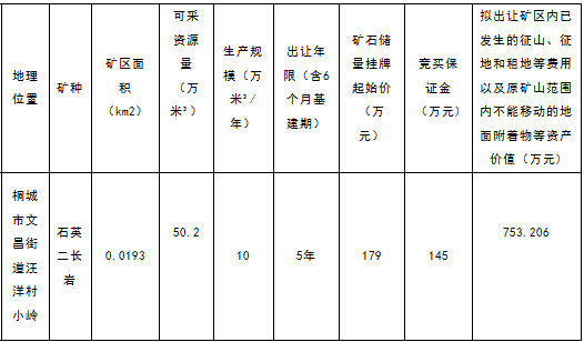 根據(jù)礦產(chǎn)資源法律法規(guī)和國土資源部《關(guān)于建立健全礦業(yè)權(quán)有形市場的通知》、《安徽省礦業(yè)權(quán)出讓管理辦法》、《桐城市人民政府辦公室關(guān)于印發(fā)桐城市非煤礦山關(guān)閉整合實(shí)施方案的通知》等規(guī)定,經(jīng)桐城市人民政府批準(zhǔn),決定出讓安徽省桐城市文昌街道汪洋村小嶺建筑石料用石英二長巖礦采礦權(quán)?,F(xiàn)就有關(guān)事項(xiàng)公告如下: