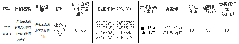 六、本次拍賣(掛牌)出讓的詳細資料、具體要求和其他未盡事宜,詳見《天全縣魚泉鄉(xiāng)獅子山灰?guī)r礦采礦權(quán)拍賣(掛牌)出讓文件》。申請人可于2017年12月14日至2018年1月3日(法定節(jié)假日除外)上午8:30~12:00,下午14:30~17:30到雅安市土地礦產(chǎn)交易中心領(lǐng)取《天全縣魚泉鄉(xiāng)獅子山灰?guī)r礦采礦權(quán)拍賣(掛牌)出讓文件》。